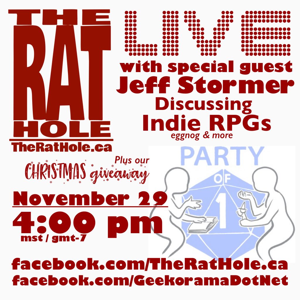 [Editors Note: Make sure you are following all our YouTube and social media at linktr.ee/TheRatHole.ca because we’ve partnered with some great indie creators on a giveaway for a package of holiday indie games. We’ll be announcing the winner on our LIVE interview with award winning GM/Podcaster Jeff Stormer of the Party of One Podcast on November 29th at 4:00 MST/GMT-7.]